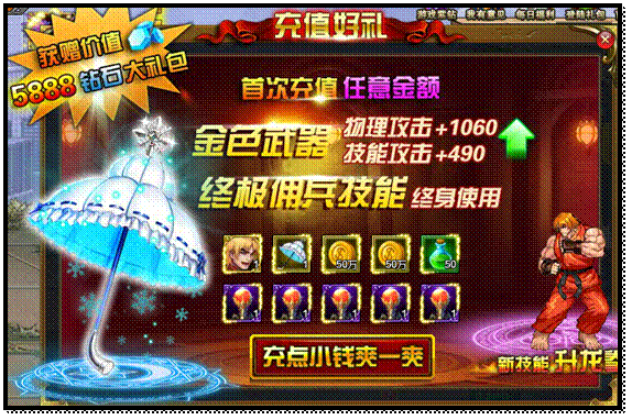 活動內容:首次充值任意金額,即可獲贈價值5888鑽石大禮包,包含紫色傭兵和酷炫坐騎。