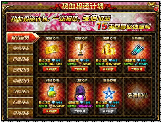 活動內容:用一定數量鑽石投資金券、聲望、金幣、潛能、經驗、占星、星神