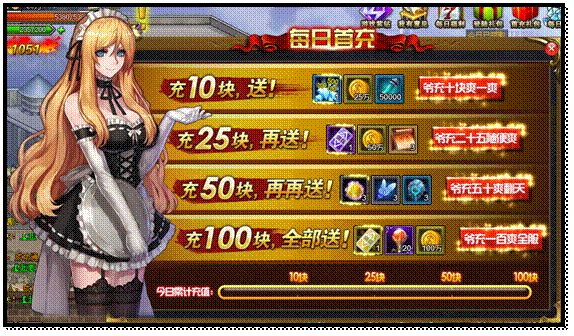 當日累計充值100鑽石:沉甸甸的鑽石寶藏、25萬金幣、5萬潛能