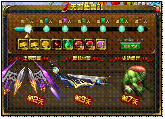 活動四:七天登入豪禮——送華麗羽翼、酷炫坐騎、史詩傭兵!