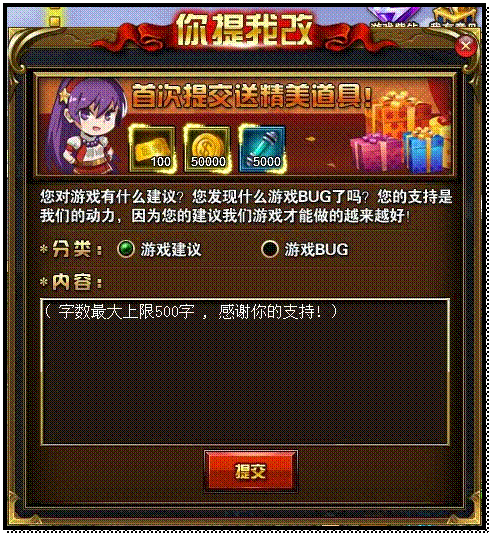 活動內容:你對遊戲有什麼建議?你發現什麼遊戲BUG了嗎?第一次提交即送精美道具!