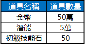 50級:500金券、5個坐騎升級卷軸、10個初級勳章、幸運傭兵寶袋B、55級成長禮包