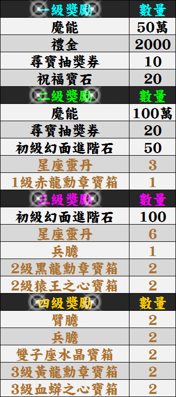 單日累積儲值獎勵只能夠獲得對應的「一級」、「二級」、「三級」或「四級」其中一種獎勵。