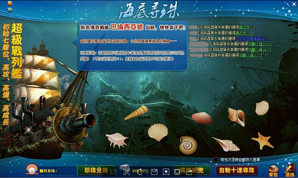 在打撈物品時,有一定幾率可以獲得珍珠。海底尋珠活動期間,珍珠可以用来兌換优秀的海員和超级战舰——巴伦西亚哦!!!