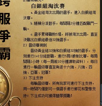 第三天開始跨服賽進入到晉級賽階段,被匹配的兩組服務器的黃金、白銀組32名選手會進行隨機分組。