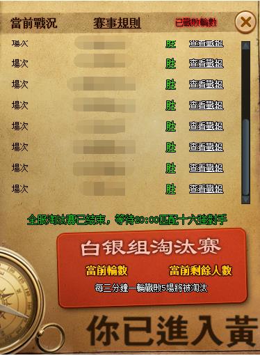 b、白銀組淘汰賽規則和之前的淘汰賽相同,每三分鐘匹配一次戰鬥,再次失敗五場的提督會被淘汰退出本次個人跨服,最後剩餘的32名選手將組成白銀組進入白銀組淘汰賽