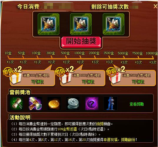 每日遊戲內消耗一定數量的金幣后,可以在每日抽獎界面領取對應的禮包。活動期間,禮包翻倍。