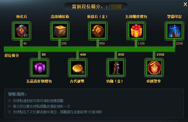 2)每個段位積分獎勵在活動時間內僅可以領取一次