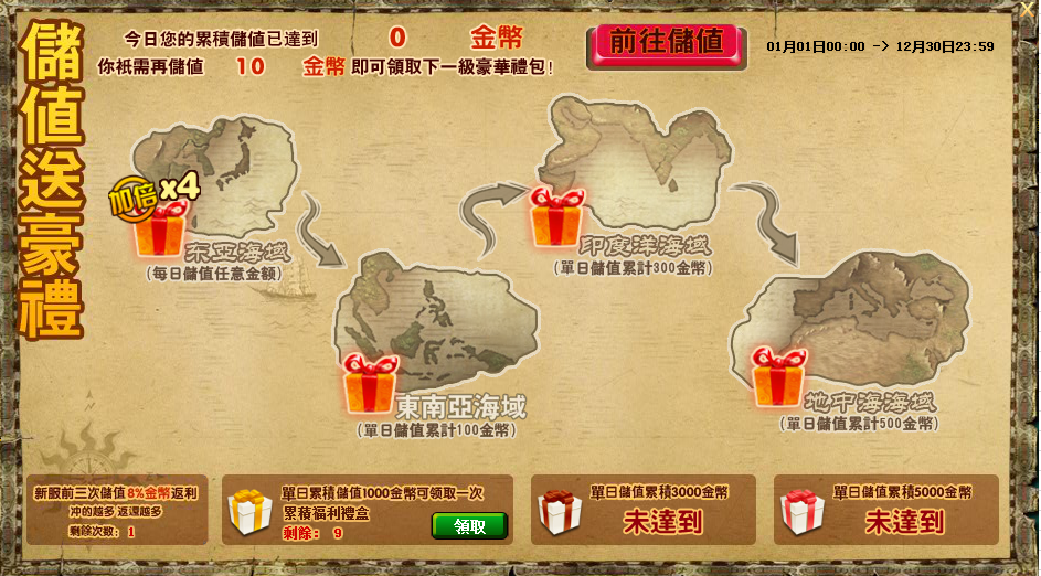 平時每天儲值任意金額,即可獲得“每日啟航禮包x1”,在活動期間,如果儲值任意金額,可獲得“每日啟航禮包x4”哦!