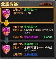 另外,當全服努力達到一定成長值,會開啟“全服得益效果”增加銀幣收益。