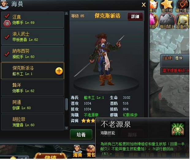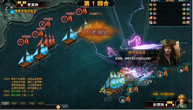 海戰技能:不老源泉——為所有已方船隻附加持續維修和重生狀態(回復一半耐久,不能與重生節能疊加)