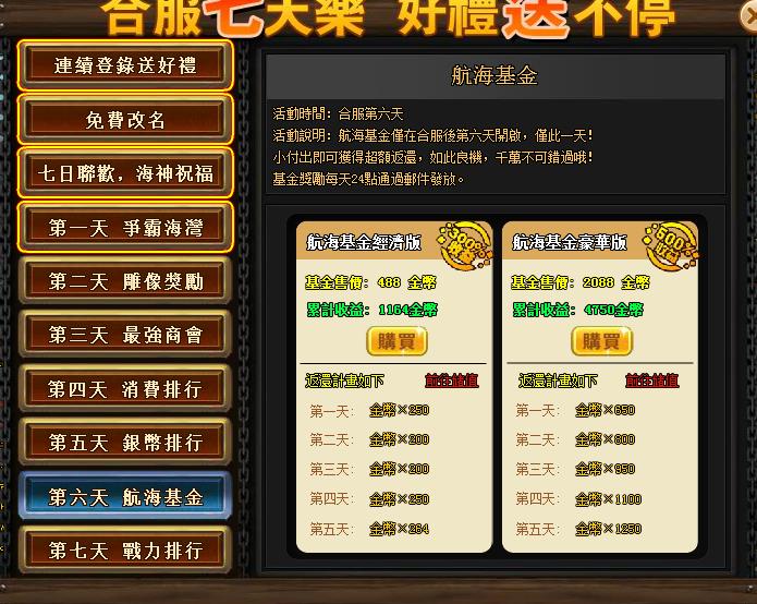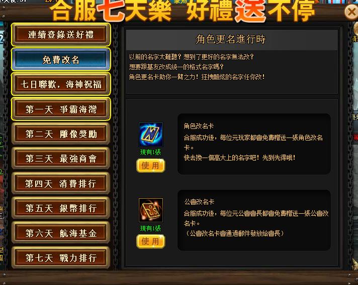 6、 合服後,金幣購買的次數會被清除(例:漁盆祈福次數、航運次數等),請在合服前使用完,避免不必要的損失。
