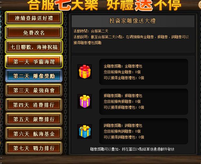 雕像獎勵:活動當天24點時,碼頭擁有金雕像、銀雕像、銅雕像可以獲得雕像禮包獎勵,獎勵可以疊加,雕像越多獎勵越多!