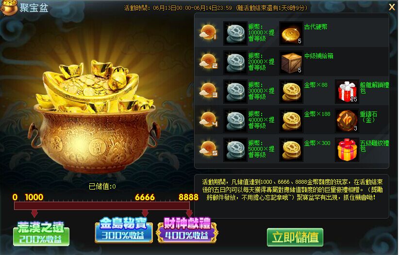 在出現聚寶盆的24小時內,只要充值滿足指定金額標準!