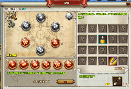 3、 當6個龍珠集齊時,消耗所有龍珠各1個可以召喚出神龍。神龍會讓你選擇一種獎勵並獲得它。